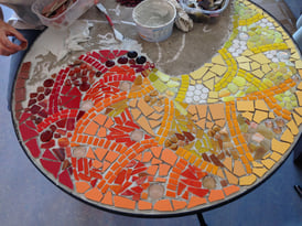 das Mosaik mit wasserlöslichem Kleber oder Mehlkleber auf starkes Packpapier geklebt. Anschliessend kann es als Ganzes mit Fliesenkleber auf das vorgundierte