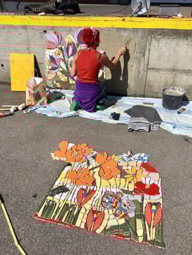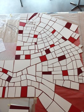 Die einzelnen Mosaikteile werden mit Polymerkleber auf ein Glasfasernetz montiert.